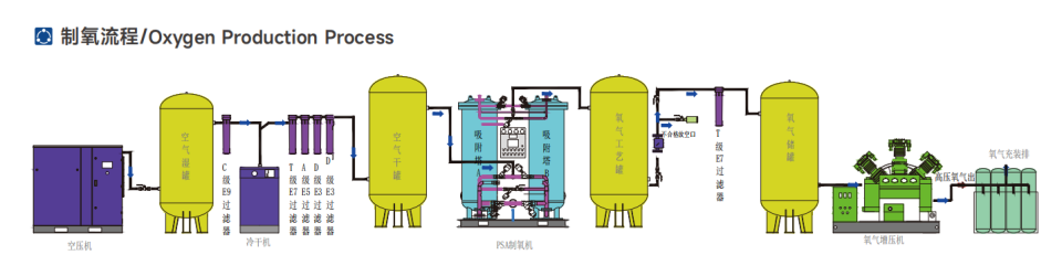 變壓吸附制氧裝置以潔凈的壓縮空氣為原料,采用高品質(zhì)的沸石分子篩作為吸附劑,在一定的壓力下,從空氣中制取氧氣。經(jīng)過(guò)純化干燥的壓縮空氣,在吸附器中進(jìn)行加壓吸附、減壓脫附。由于空氣動(dòng)力學(xué)效應(yīng),氮在沸石分子篩微孔中擴(kuò)散速率遠(yuǎn)大于氧,氮被沸石分子篩優(yōu)先吸附,氧在氣相中被富集起來(lái),形成成品氧氣。然后經(jīng)減壓至常壓,吸附劑脫附所吸附的氮?dú)獾入s質(zhì),實(shí)現(xiàn)再生。一般在系統(tǒng)中設(shè)置兩個(gè)吸附塔,一塔吸附產(chǎn)氧,另一塔脫附再生,通過(guò)PLC程序控制器控制氣動(dòng)閥的啟閉,使兩塔交替循環(huán),從而取得純度較高的氧氣(93%±3%)。
